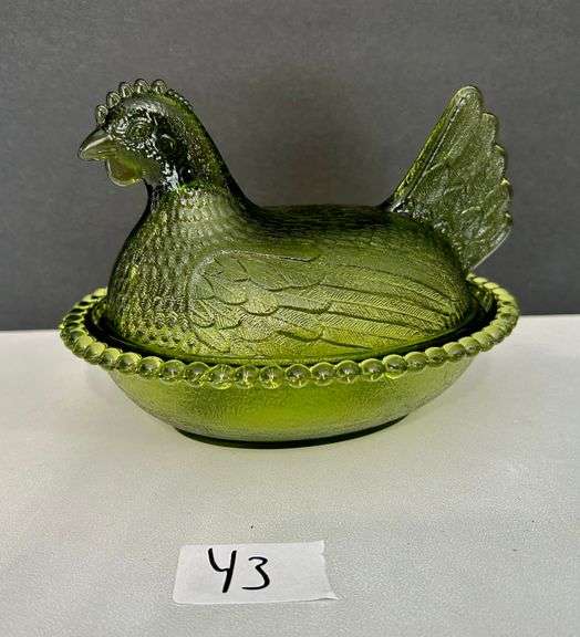 LOT 43 - Green Glass Chicken on Hen Candy Dish (Located in Kitchen)