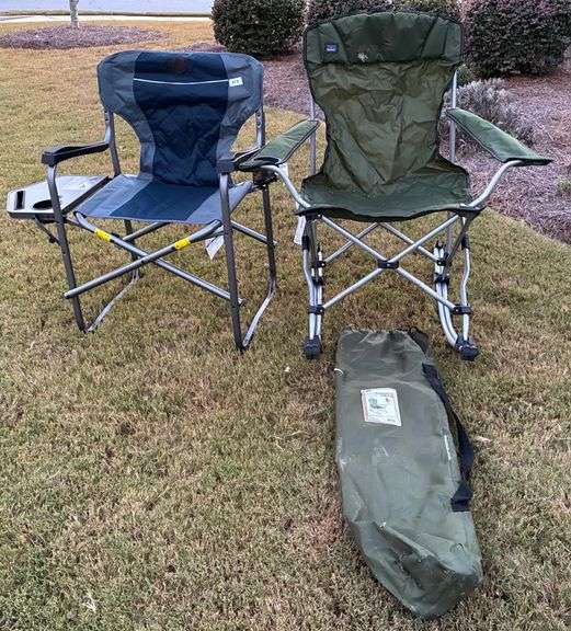 LOT 353 - 2 pc Folding Chair with Cup Holder Shelf and Folding Rocking Chair (Has Damage) (Located Garage)