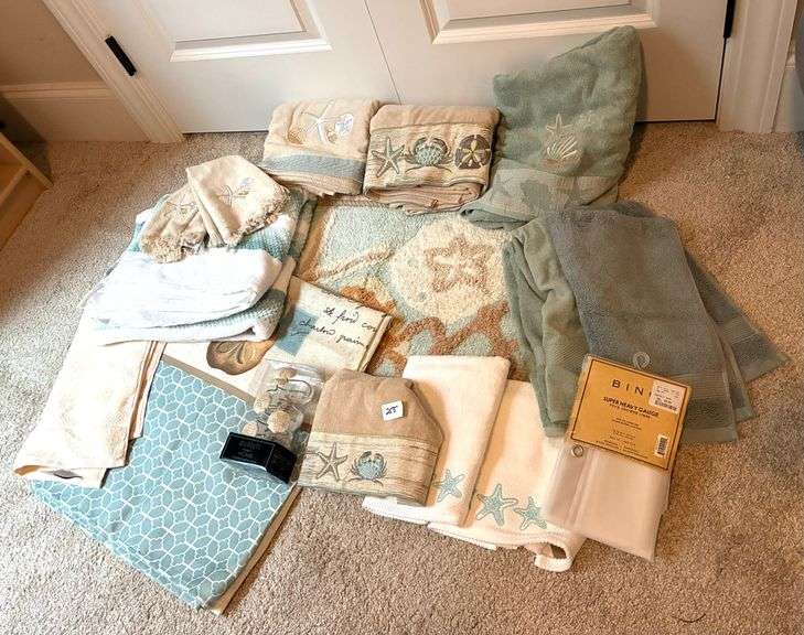 LOT 255 - Shell Shower Curtain, Towels, Rug and More (Located Downstairs Bathroom)
