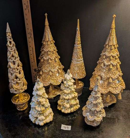 LOT 49 - 7 pc. Gold decorative Christmas trees with red plastic basket(located in living room closet)
