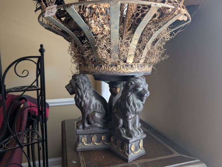 LOT 62 - Lion metal planter with artificial decor, planter is 16" tall, 18" diameter (located in dining room)