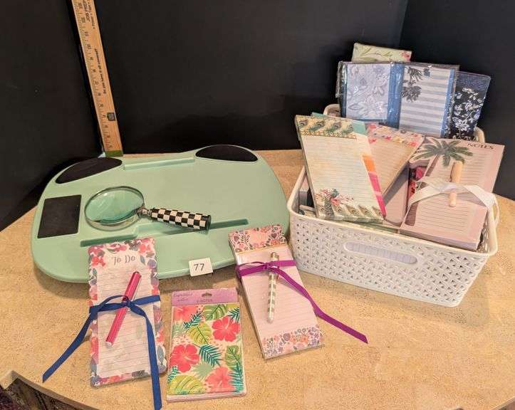 LOT 77 - Stationary sets, lap desk, checkered magnifying glass, notecards, to do list magnets, and more(livin
