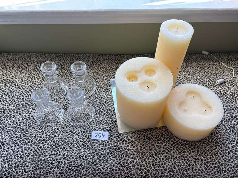 LOT 254 - 2 pc Large Decorative Candles and 4pc Glass Candle Stick Holders