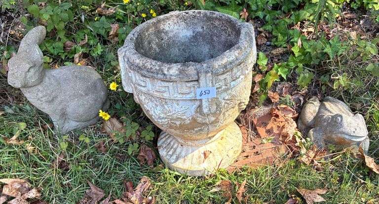 LOT 650 - 3 pc Concrete Planter, Frog, and Rabbit (Missing Ear) (Located Basement Storage)