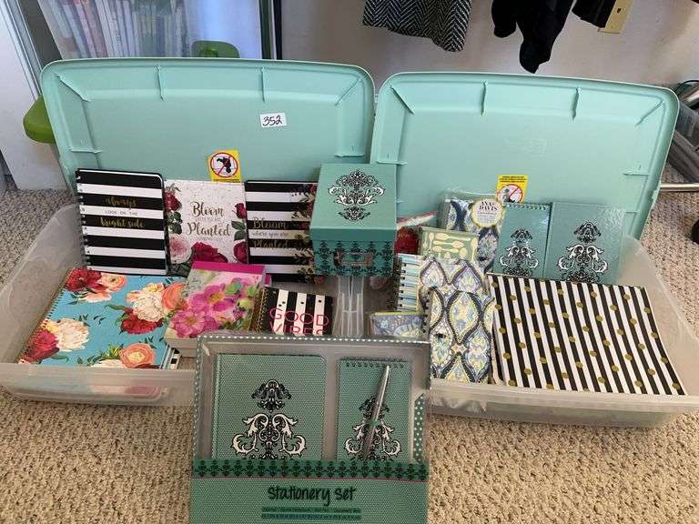 LOT 352 - 2 bins of file folders, stationary and note pads, located in master bedroom sitting area