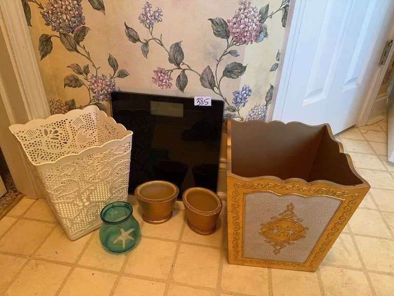 LOT 385 - Bathroom waste baskets, scales and more, located in master bathroom