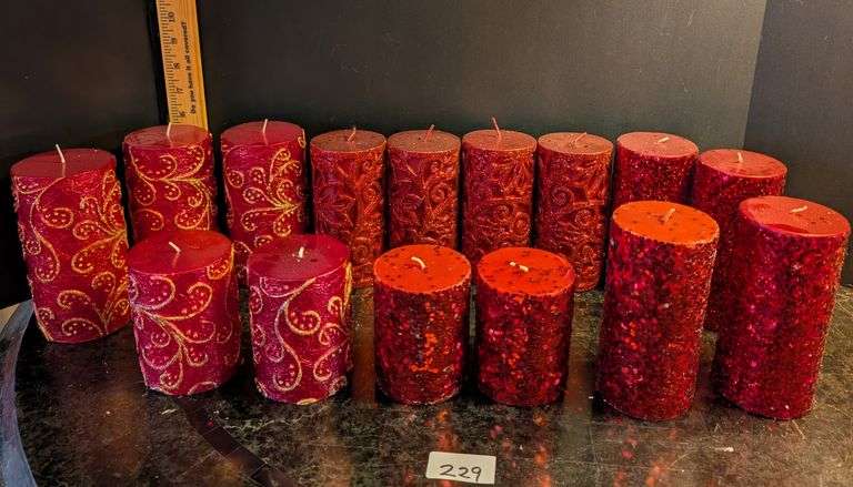 LOT 229 - 15pc. Red and gold decorative pillar candles(located in living room cabinet)