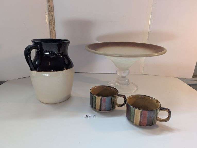 LOT 507 - 4 pc.-Vintage Brown USA jug pitcher, Glass pedestal bowl, and mugs(located in garage)