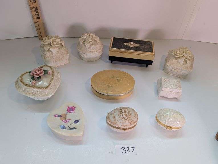 LOT 327 - 10 pc- Vintage music jewelry box, trinket boxes with lids-Alabaster hand carved made in Italy, crack